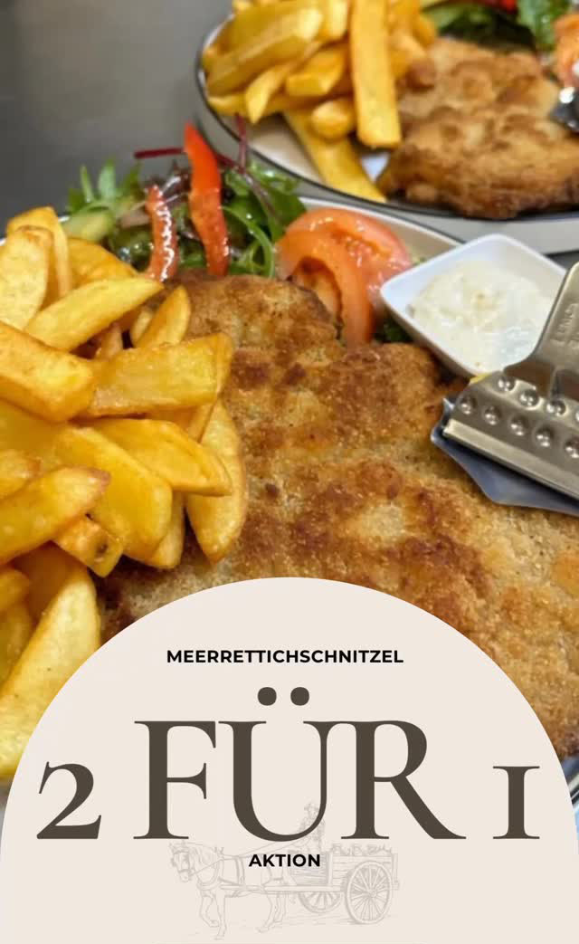 Bring deine Lieblingsperson mit und genießt zwei Meerrettichschnitzel mit Pommes zum Preis von einem.