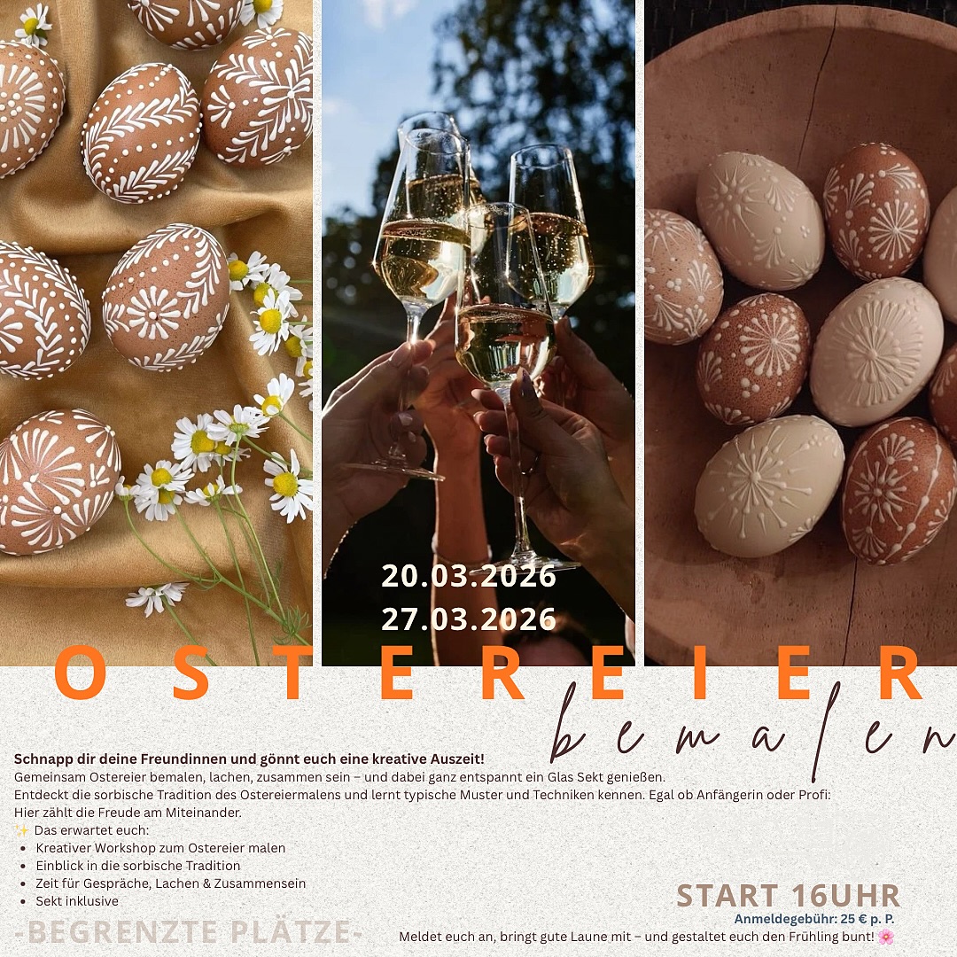 Drei Ostereier, eine liebevolle Anleitung durch den Abend sowie begleitender Sektgenuss während des gesamten Abends. 🥂👩🏻🎨 Freue dich auf entspannte Gespräche, gemeinsames Gestalten und eine gemütliche Atmosphäre.